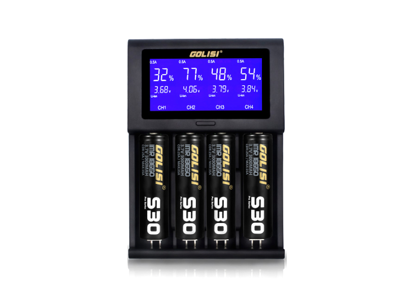 Inteligentní nabíječka s HD LCD displejem, USB napájecím portem s příkonem DC 12V/2A a se čtyřmi na sobě nezávislými sloty pro Li-ion baterie a širokou škálu Ni-mh/Ni-cd baterií o délce 32mm až 70mm.